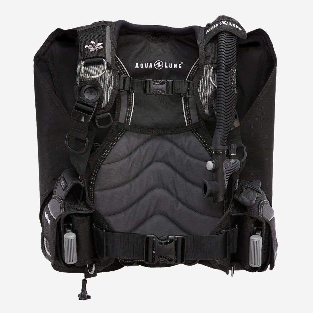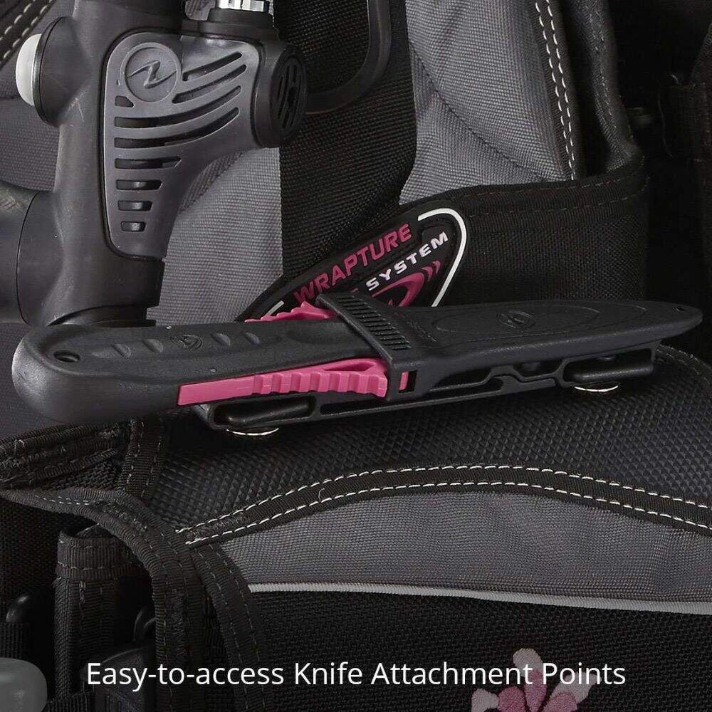 - Wrapture Harness System: Patented swivel shoulder buckles and an ultra-thin back plate provide improved comfort, prevent the BCD from riding up at the surface, and keep the cylinder close to your center of gravity to transfer weight to the hips when standing out of the water.