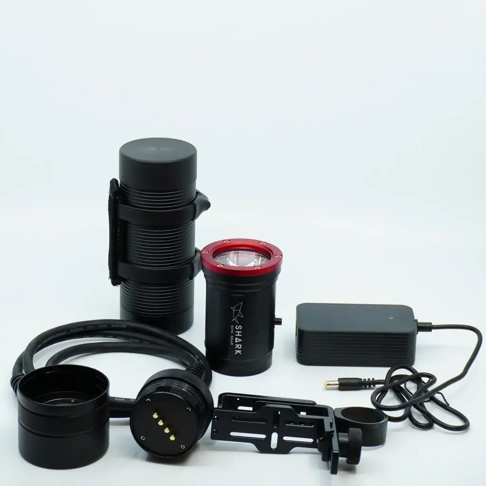 The Shark Artemis side mount light is the latest addition to the Shark dive light range, designed with a 90 degree cable fitment and longer cable, for side mount divers who needs to illuminate an entire dive site! With its robust features, this primary dive light ensures optimal visibility underwater. Light Output: 6000 lumens Light Levels: 20%, 50%, and 100% brightness settings Burn time: Operational Mode: 360 minutes, Boost Mode: 180+ minutes, Low Output Mode: 10+ hours Magnetic On/Off Switch: Easy to operate with gloved hands Battery Capacity: 95Wh Light Head Weight: 0.5 kg (on land) Battery Pack Weight: 1 kg (on land) Reflector Diameter: 55 mm Light Head Length: 13 cm Included Accessories: Goodman handle, charger, and a durable hard nylon case for safe transport and storage. This powerful, compact light offers a focused beam and exceptional durability, making it a reliable companion for technical divers and underwater enthusiasts.