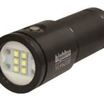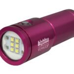 High-performance submersible light with multiple output levels and red LEDs, tested to 100 m. Compact design with wide 120° beam and built-in battery indicator.